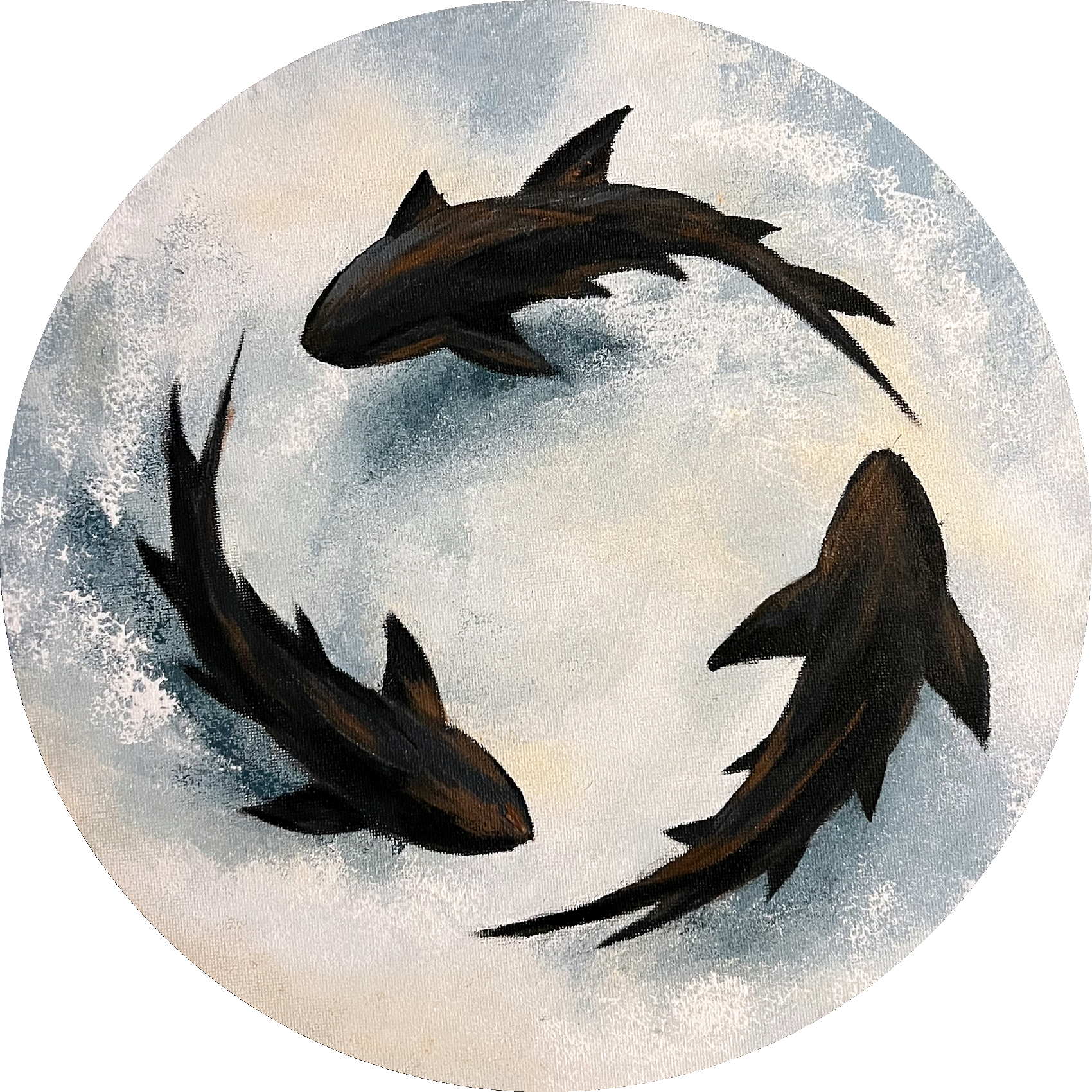Apvali kompozicija talpina tris ryklius, judančius šviesiame vandens fone. Švelnios spalvos susilieja tarpusavyje, o tamsūs siluetai juos perskrodžia ryžtingai, kurdami įtampą tarp ramybės ir vidinės jėgos. Jie juda atskirai, bet kartu — lyg laikomi bendroje orbitoje.