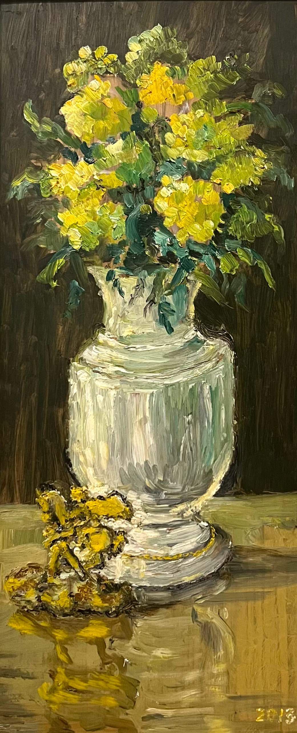 A vibrant flower graces a vase alongside a detailed Lithuanian coat of arms statue, symbolizing the fusion of natural beauty and cultural pride. Created under the guidance of a renowned Lithuanian sculptor and painter, the artwork is a collaborative masterpiece.