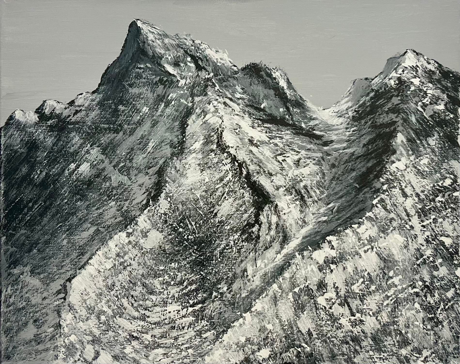 "Picture a quiet mountain scene in black and white. The dark slopes meet the bright peaks, making a peaceful and powerful painting that feels like a timeless adventure in the mountains.